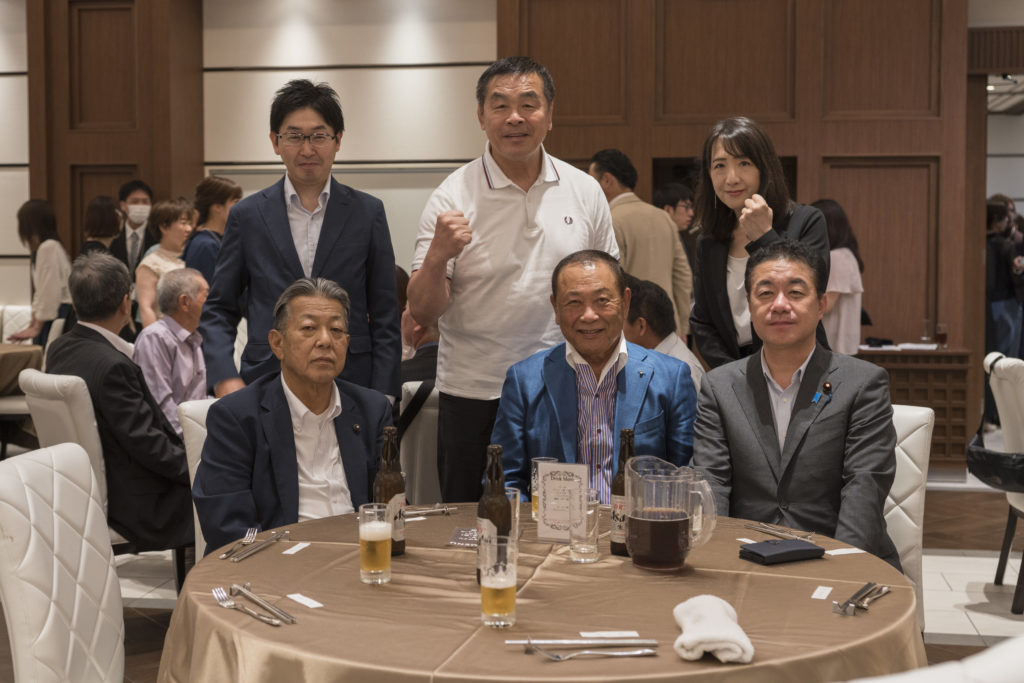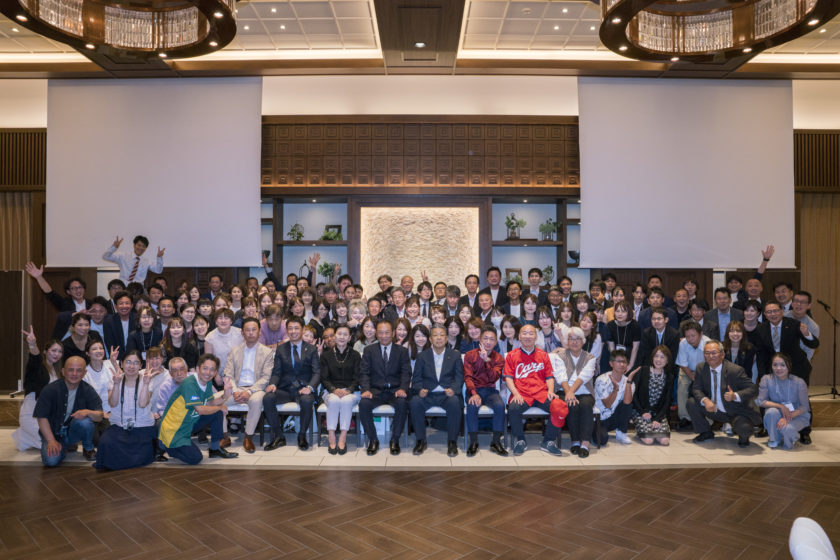 ㈱メビウス、㈱トップス、㈱アクティブホールディングスの社員と日頃からお世話になっているお得意先様に加え、先月のバーベキュー大会に続き馳浩石川県知事、小森卓郎衆議院議員、紐野義昭石川県議にも公務終了後にご出席いただき、総勢約130人で社長の誕生日をお祝しました。